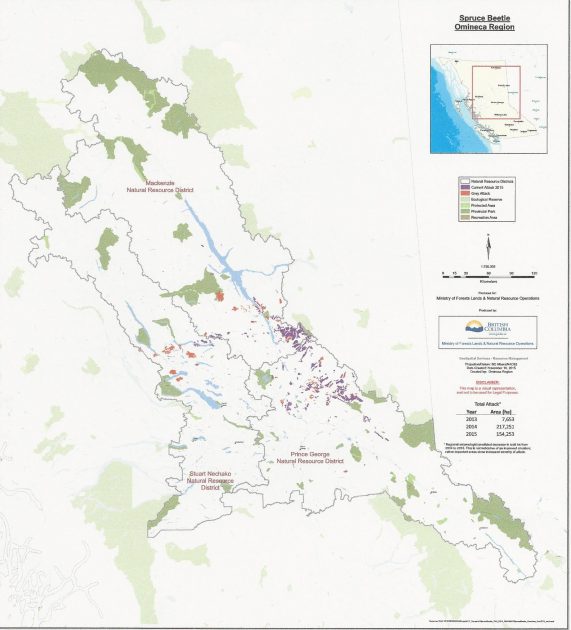 Prince George B.C. – The battle against the Spruce Beetle is in full force, but it will be fall before it’s known if the epidemic has been stemmed. The beetle has already infested 156 thousand hectares of forest in the Omineca region, specifically northern reaches of the Prince George Timber Supply area, and the eastern valleys of the Mackenzie timber supply. Trees infested by the Spruce Beetle can take a year to 18 months to show signs they have been attacked. Infested trees can change colour from green, to yellow to red or they can have a green and healthy crown to losing all their needles.