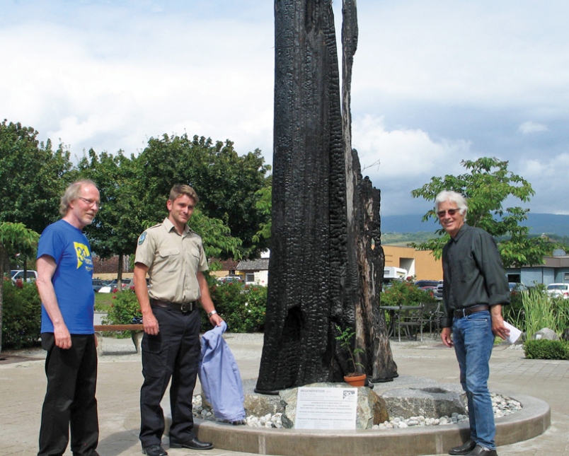 A dedication ceremony for Regeneration, an artwork by Gordon Halloran, took place outdoors by the Sechelt Visitor Centre last Saturday afternoon. The artist, District of Sechelt Mayor Bruce Milne and the Sunshine Coast Community Forest’s David Lasser spoke to the public and thanked many contributors to the project. The sculpture, two charred cedar trees, is dedicated to all those who protect the forest from wildfires and especially to tree faller John Phare, who lost his life fighting the Old Sechelt Mine fire. In honour of Phare’s memory, eight members of the Wildfire Management Forest Service crew were also on hand to watch while Forest Protection staff member Stephen Gemmell unveiled the memorial plaque.