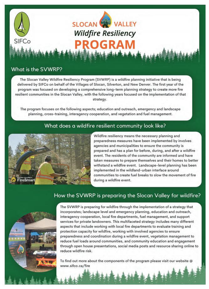SIFCo is a leader in the Slocan Valley in the education of the community about the importance of FireSmart and WRR activities on crown and private land leading to a resilient community.